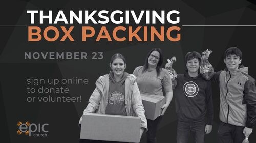 We are collecting non-perishable items to fill at least 120 Thanksgiving Boxes for families in our community! Please have all the non-perishable items to Epic by Sunday, November 16th. We also need volunteers to help set up Saturday, Nov 22nd, and help deliver the Thanksgiving Boxes to area schools on Monday, November 24th.